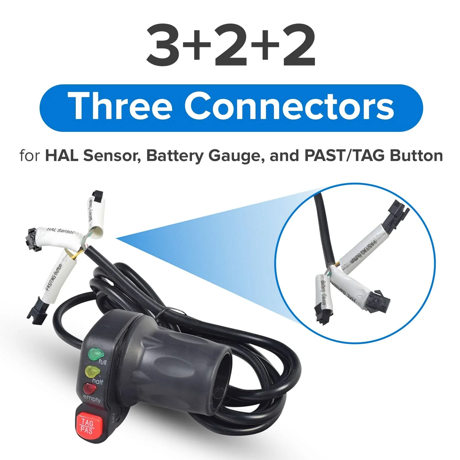 This throttle has three connectors; HAL Sensor, Battery Gauge, and PAST/TAG Button. Total wire length is 70 inches.