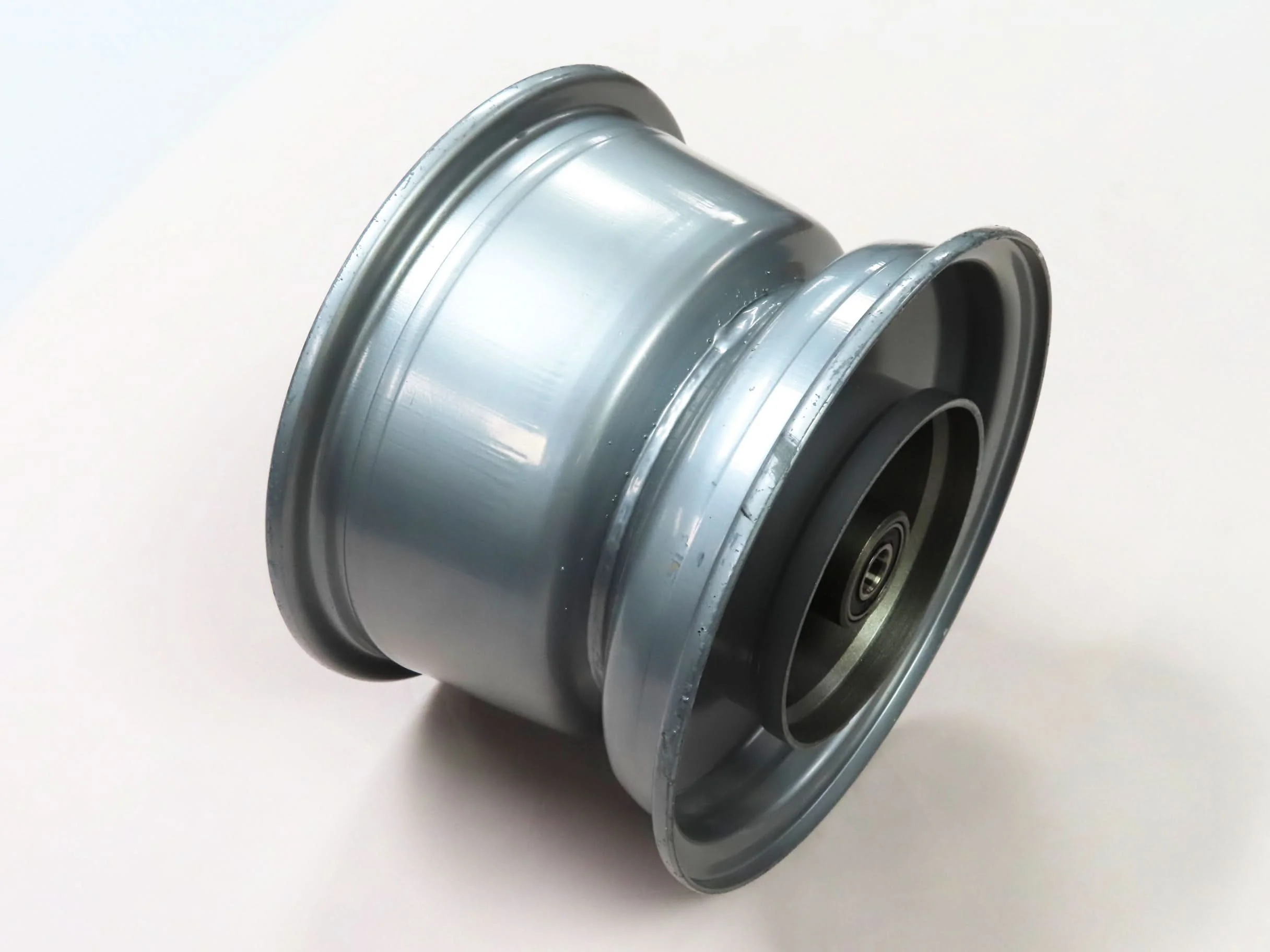 The rear rim for the Coleman CT200U Trail and CT200U-EX mini bikes comes in a bright silver finish. This 9" rear rim uses a 4-hole mounting plate with pre-installed bearings. The chain sprocket attaches directly to the rim's mounting plate.
